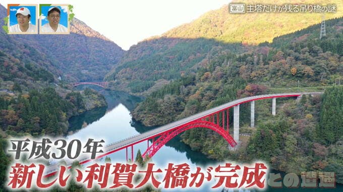 平成に入ると吊り橋のワイヤーも取り外され、今は主塔だけが当時の面影を残しています。そして、平成30年に新しく「利賀大橋」が上流に架け替えられ、新たなシンボルとなっています。