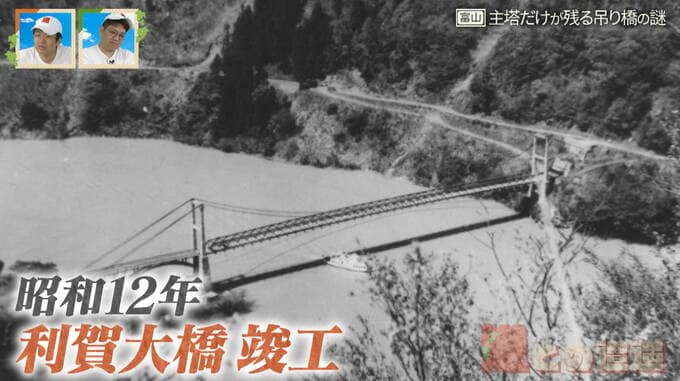 その「利賀大橋」は吊り橋で、従来の歩道橋から幅のある車道橋へと変更したこともあり、生活道路・産業道路の両面で活躍。大雪や火災に見舞われることがたびたびありましたが、修復を繰り返しながら使用されていました。
