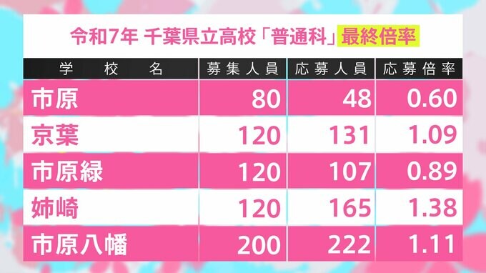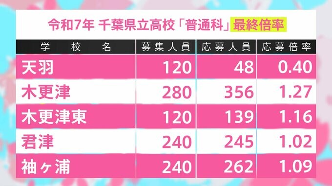 千葉県立高校入試2025 全日制普通科 最終志願倍率は東葛飾2.05倍、船橋1.83倍、薬園台1.66倍に【令和7年度高校受験】 TBSテレビ 2025年2月14日(金) 14:50 国内 学校別の一覧 姉崎1.38倍、木更津1.27倍