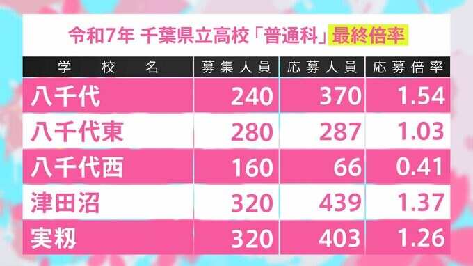 千葉県立高校入試2025 全日制普通科 最終志願倍率は東葛飾2.05倍、船橋1.83倍、薬園台1.66倍に【令和7年度高校受験】 TBSテレビ 2025年2月14日(金) 14:50 国内 学校別の一覧 八千代1.54倍、津田沼1.37倍