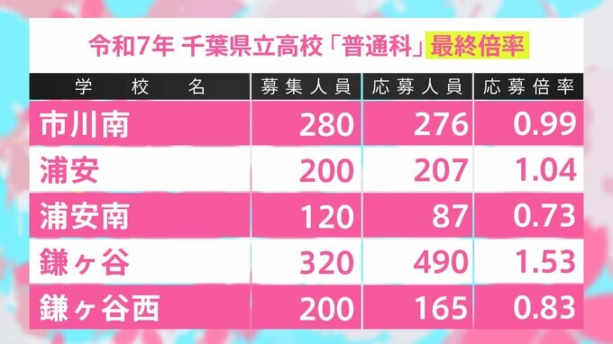 千葉県立高校入試2025 全日制普通科 最終志願倍率は東葛飾2.05倍、船橋1.83倍、薬園台1.66倍に【令和7年度高校受験】 TBSテレビ 2025年2月14日(金) 14:50 国内 学校別の一覧 鎌ヶ谷1.53倍、国分1.46倍