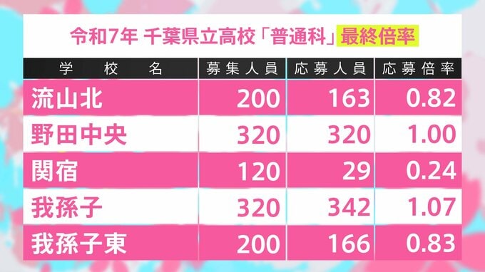 千葉県立高校入試2025 全日制普通科 最終志願倍率は東葛飾2.05倍、船橋1.83倍、薬園台1.66倍に【令和7年度高校受験】 TBSテレビ 2025年2月14日(金) 14:50 国内 学校別の一覧 柏中央1.35倍、流山おおたかの森1.34倍