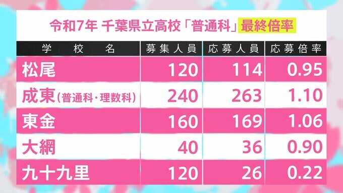 千葉県立高校入試2025 全日制普通科 最終志願倍率は東葛飾2.05倍、船橋1.83倍、薬園台1.66倍に【令和7年度高校受験】 TBSテレビ 2025年2月14日(金) 14:50 国内 学校別の一覧 成東1.10倍、東金1.06倍
