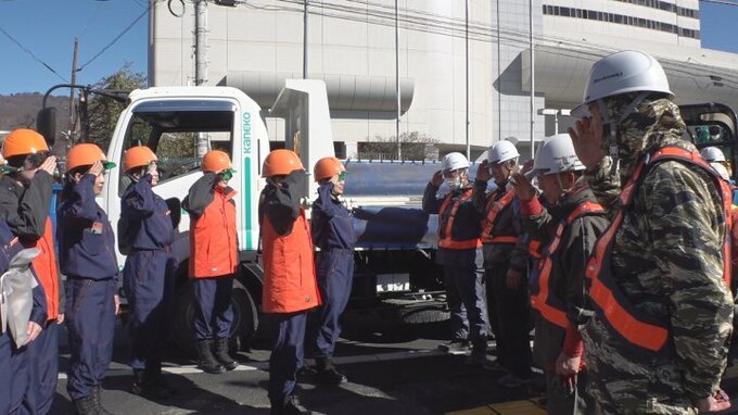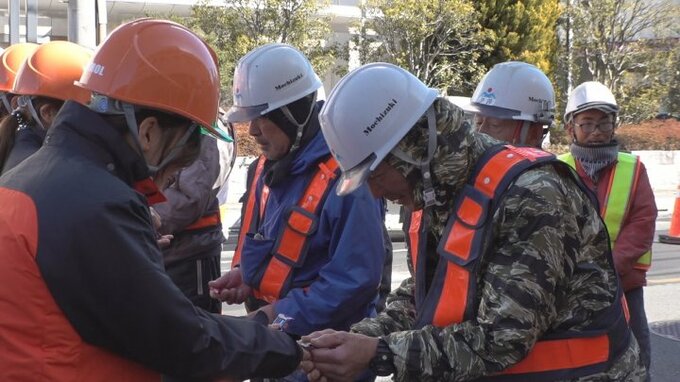 このうち甲府市湯村の工事現場では、今年の干支にちなんだ「ヘビー級の安全対策で危険を巳(み)逃さない」というメッセージとともに、作業員にチョコレートを手渡し、安全を呼びかけました。