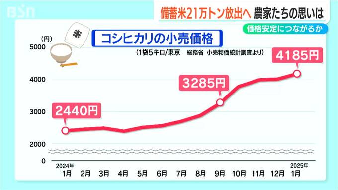 理由はコメの価格高騰です。コシヒカリの価格は1年前、2400円程度でしたが、去年9月に3000円を突破。新米が出回っても価格は下がらず、今年1月には4000円に達しています。