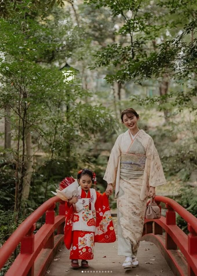 おのさんは「七五三のお参りは結婚式を挙げた赤坂氷川神社にお願いしました。」とテキスト。競泳選手で夫の塩浦慎理さんと、長女をはさんで仲睦まじい様子の写真を投稿しつつ「(結婚式のときと)同じロケーションで写真も撮っていただいた」と明かしました。