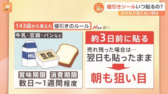 約3日前に貼られるということで、値引きシールを貼って売れ残った場合も、翌日も貼ったままだそうです。なので、朝も値引きシールが貼られていて、狙い目かもしれません。