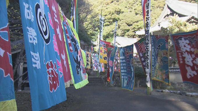寺の境内には、奉納された多くの大漁旗が。“御船祭”は三重県・鳥羽市の青峯山(あおのみねさん)の山頂にある正福寺(しょうふくじ)で毎年開かれ、伊勢志摩の漁師や海女らが一年の海の安全と豊漁を祈願します。