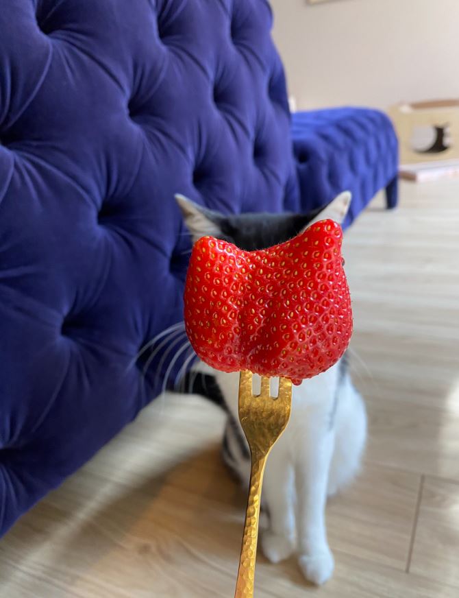その写真のイチゴは、小ぶりで尖った2つのイチゴが生育途中でくっついたような形をしていて、逆さまになっていると、2つの尖った部分が並んでいてまさに「猫耳」。さらに藤さんは、そのイチゴを愛猫 ”オレオ” の顔に当てはめていて、オレオの細面な顔にぴったりフィットしています。