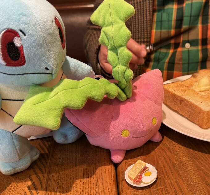 1枚目は、トーストにベーコンと目玉焼きが乗ったお皿を前に、『ポケットモンスター』のゼニガメとハネッコが、朝食を食べようとしている様子。