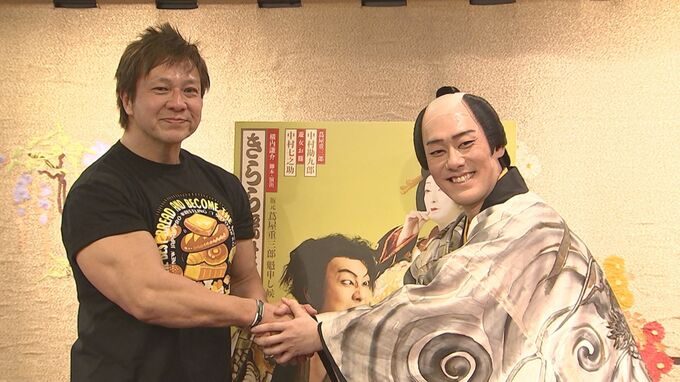 大の「プロレス好き」の勘九郎さん。劇中にはプロレス場面も繰り広げられるということで、小島さんが歌舞伎座に来場すると、“ありがとうございます〜!いや〜、嬉しい!学生時代からずっと(小島さんを)見させていただいてた”と、初対面の喜びを爆発させて、固い握手を交わしました。