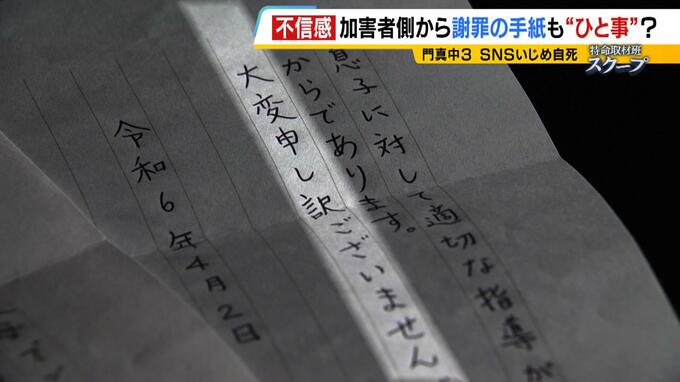 第三者委員会がいじめを認定したあと、加害生徒に認定された1人と、その親から謝罪の手紙があった。
