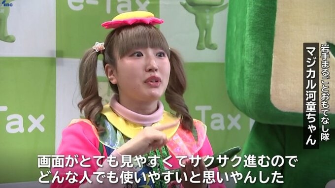 17日は県の観光PRを行う岩手まるごとおもてなし隊の「マジカル河童ちゃん」がスマートフォンを使ってe-TAXでの確定申告を体験し、便利さをPRしました。