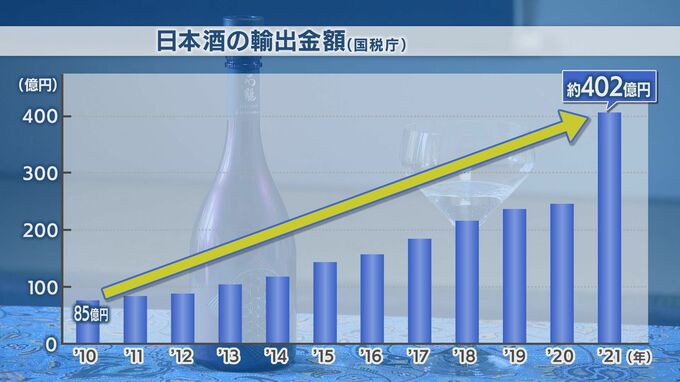 2010年に85億円だった日本酒の輸出金額は、和食ブームなどを背景に去年は約402億円と5倍近くにまで伸びています。