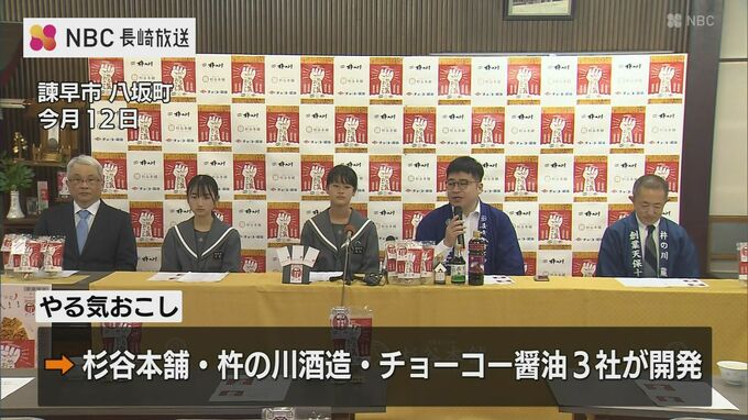 諫早市立明峰中学校の生徒が、職場体験から地元企業のコラボ商品を提案。杉谷本舗、杵の川酒造、チョーコー醤油3社が開発し、醤油味に香辛料をきかせました。