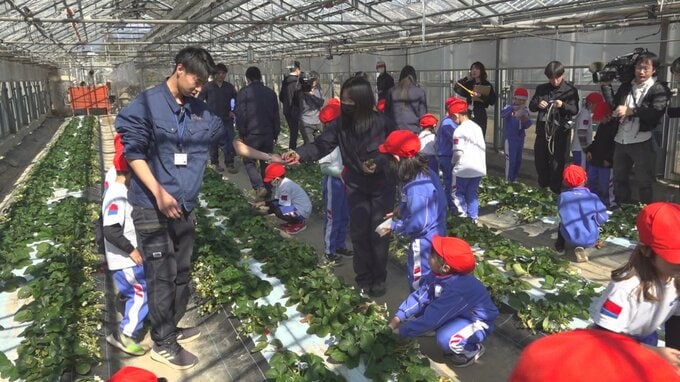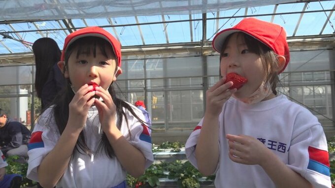 小学生たちは“おにいさん” “おねえさん”が育てたイチゴを口いっぱいにほおばっていました。