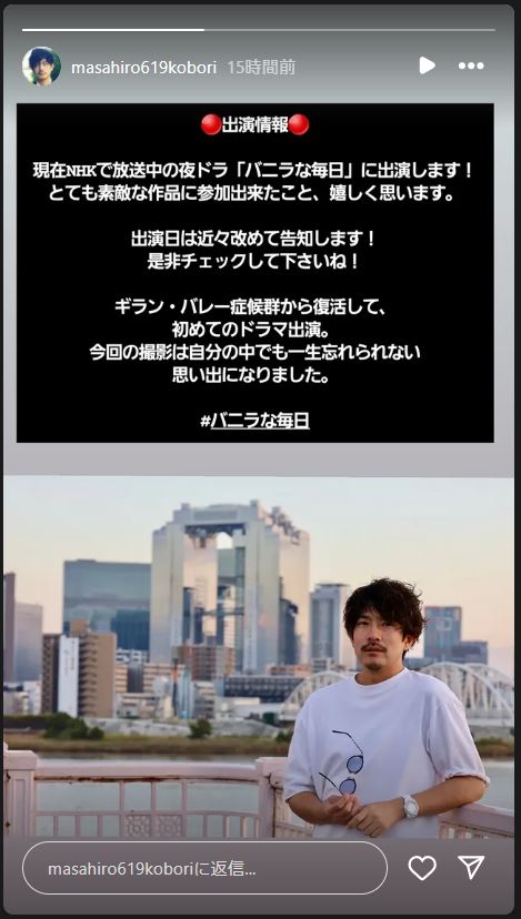 17日、俳優の小堀正博さんが、自身のSNSを通じて「ギラン・バレー症候群」に罹り、退院・復活して、初めてのドラマ出演を明かしました。