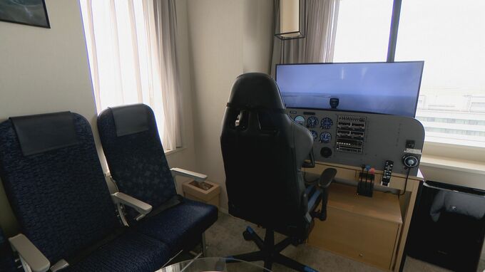 「ANAとコラボした客室では、航空機の椅子やフライトシミュレーターなど、飛行機にまつわるアイテムが、いたるところに飾られています」