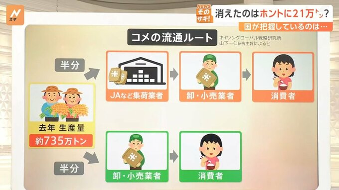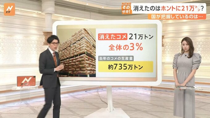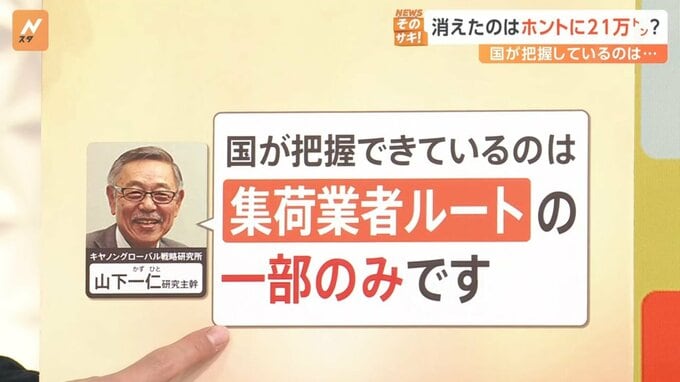 つまり国が把握しているのは、約735万トンの半分うち、大手業者の取り引き分のみで、そこから“消えたコメ”を算出しているので、実際には21万トン以上なのではないかということです。