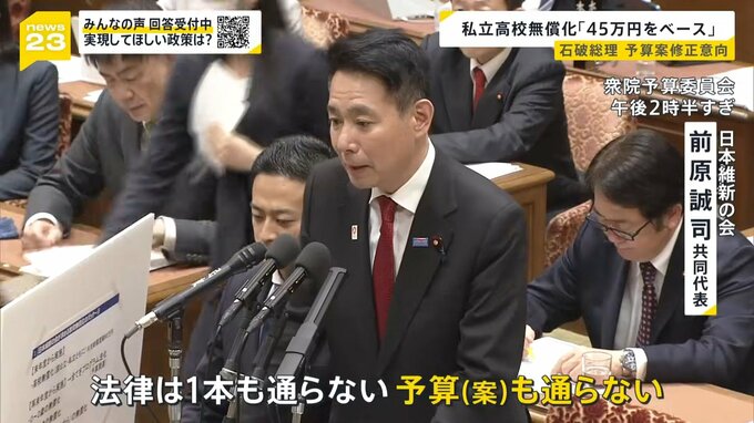 2月17日、予算委員会でこう切り出した日本維新の会の前原共同代表。高校授業料の無償化を巡り、石破総理をただしました。