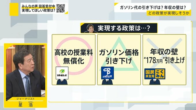 各党が政策の実現に向けて協議が激しくなっていますが、いま焦点になっている主な政策について星さんの取材です。2026年4月の高校の授業料無償化が〇、ガソリン価格の引き下げは△、年収の壁“178万円”引き上げは✕といったような感じです。この差をどう見ればいいのでしょうか?