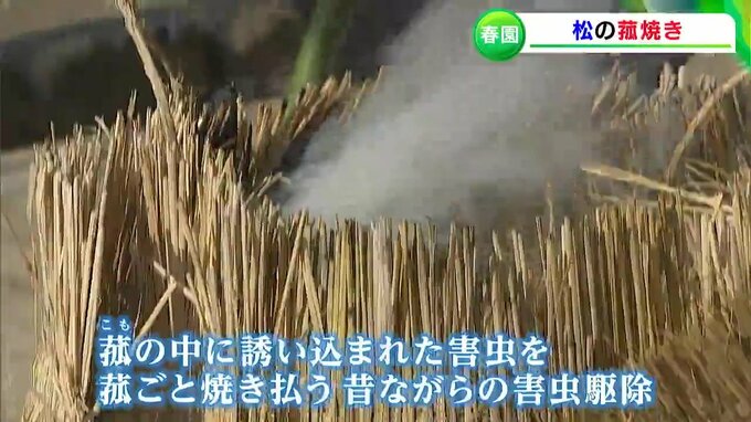 「そろそろ、この菰の中に誘い込まれて眠っている害虫を春の目覚めの前に、寝込みを襲って駆除してしまおう、という伝統行事、菰焼きが行われる時期が、ちょうど今頃です」