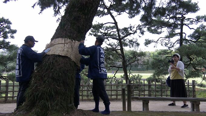 「これを『菰巻き(こもまき)』といって、冬の間、マコモや稲わらなどで編まれたむしろを樹木(特に松の仲間)に巻き付けているものです」