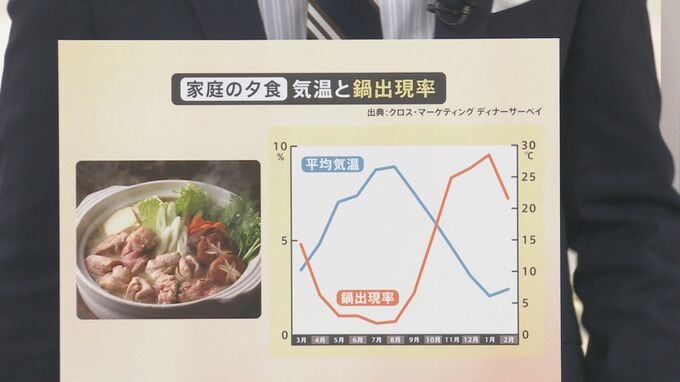 こんな面白いデータもあるんですよね。こちらのグラフは夕食に鍋がどれぐらい出現するかという率を調べたものです。この青線が平均気温、オレンジ線が鍋の出現率になってます。気温が上がっていきますと、鍋の出現率は下がります。逆に気温が下がってくる1月、気温が5度ちょっとぐらいのときには夕食での鍋の出現率が10%近くになるというようなデータもあるんです。