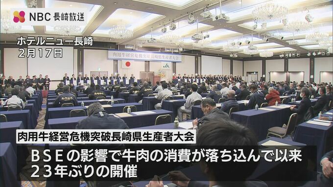エサ代や燃料費の高騰などで肉用牛の生産が厳しさを増す中、団結して危機を乗り越えようと長崎県内の生産者らが集まる大会が長崎市で開かれました。