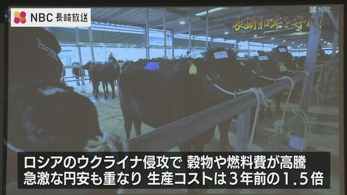 JAグループ長崎によりますと、長崎県内の肉用牛飼育頭数はおととし全国5位に上がったものの、ロシアのウクライナ侵攻による穀物や燃料費の高騰に急激な円安が重なり生産コストは3年前の1.5倍となっています。