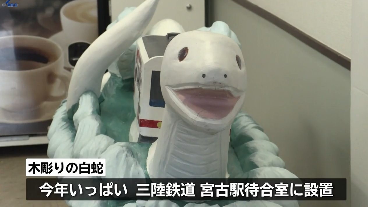 この木彫りの白蛇は、2025年いっぱい三陸鉄道宮古駅の待合室に設置され、利用者を見守ります。