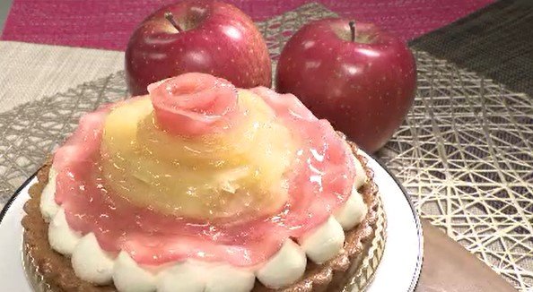 信州りんごをたっぷり使ったタルトがグランプリに輝きました。大きなバラのデザインのタルト。実はこのバラ、信州産のリンゴで作られています。大豆粉で作ったタルト台や、豆乳で作ったソイカスタードなど素材にも…
