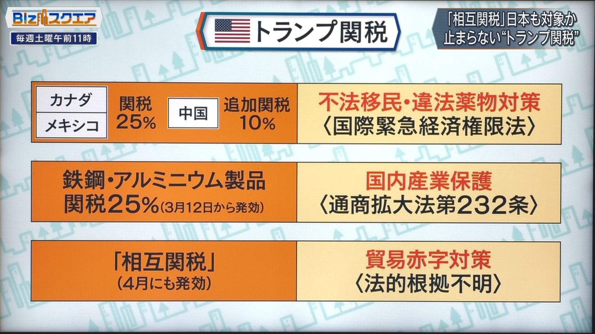いくつも違う関税戦争が出てきている。トランプ大統領は、アメリカに流入する不法移民や薬物対策として、カナダ・メキシコに25%、中国に10%の追加関税を課すとしている。また、鉄鋼アルミニウム製品には25%の関税。アメリカに高い関税を課している国などに同じように関税を課す「相互関税」も打ち出している。