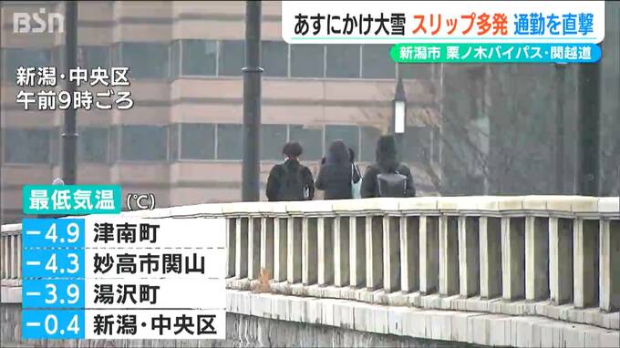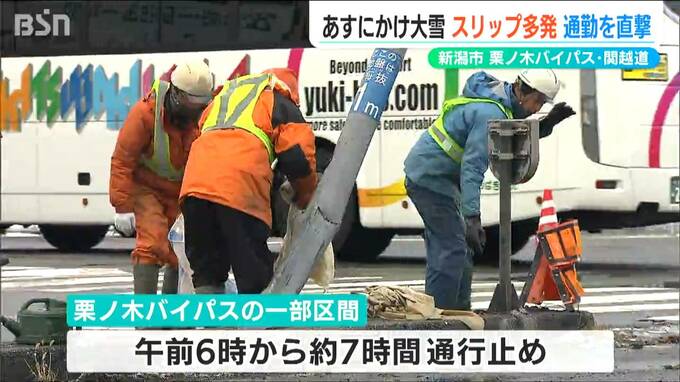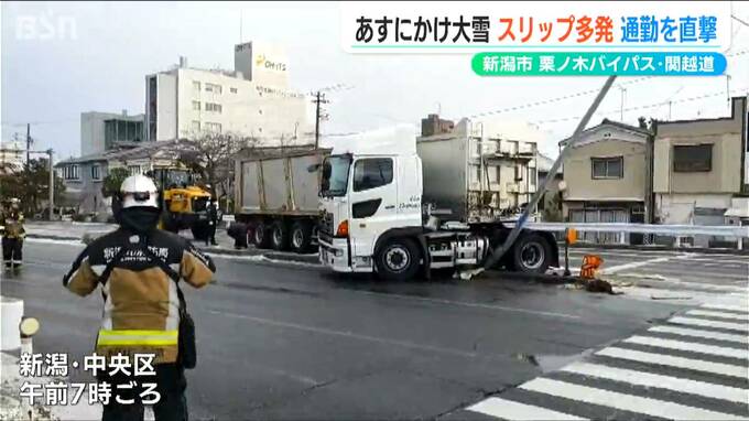 凍結によるスリップ事故が多発し、新潟市 中央区では大型トレーラーがスリップし電柱を倒しました。