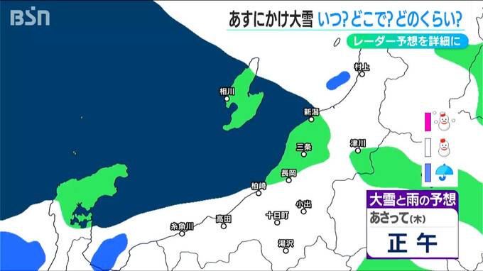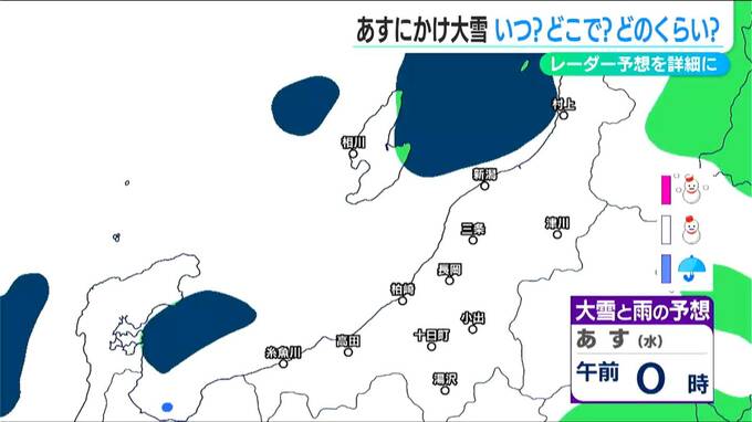 20日木曜日の朝までは県内全域で雪が続きますが、日中は下越から止んでゆきます。
