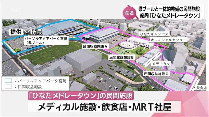 宮崎市錦本町に完成した宮崎県の新しいプールと一体的に整備される民間施設の総称が「ひなたメドレータウン」に決まりました。河野知事は、18日の会見で、4月に供用開始される県の新しいプール「パーソルアクアパ…