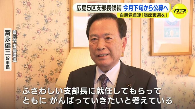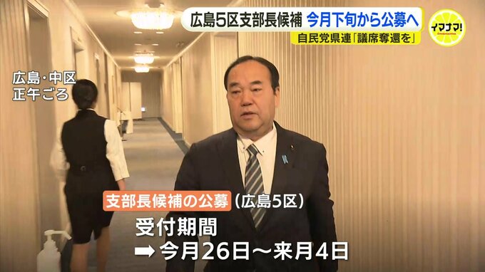 県連によりますと、広島5区の支部長候補を公募する受付期間は、今月26日から来月4日まで。書類審査や面接などを行って、来月17日をめどに決定したいということです。
