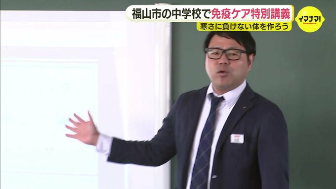 寒さで乾燥した日が続く中、体調管理のために免疫ケアについて学ぶ特別講義が、広島県福山市内の中学校で開かれました。
