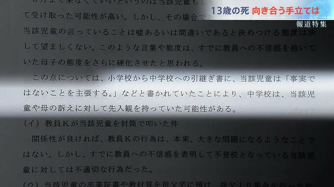 小学校から中学校への引き継ぎ書には、翔さんは「事実ではないことを主張する」などと書かれていたことも判明。翔さんや母親の訴えに対して、中学校が先入観を持っていた可能性があると指摘した。
