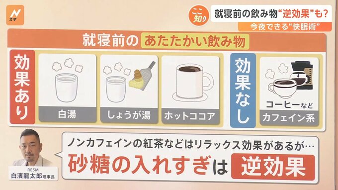 “睡眠のスペシャリスト”白濱氏は「ノンカフェインの紅茶などはリラックス効果があるが、砂糖の入れすぎは逆効果」と指摘します。