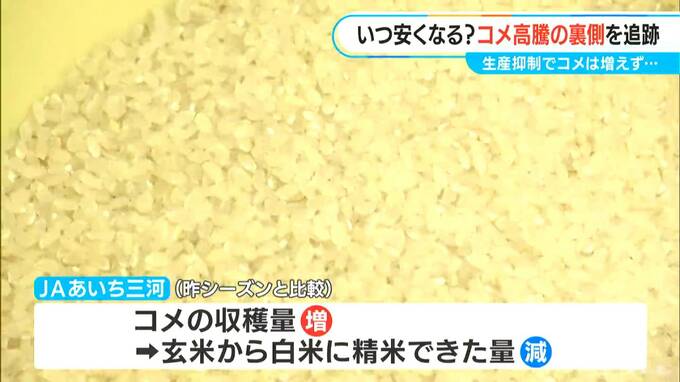 コメの収穫量自体は昨シーズンと比べ増えていますが、去年の猛暑でコメの発育不足が起きていて、JAあいち三河の場合、玄米から白米に精米できた量は減っていると言います。