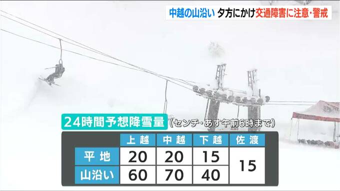 20日の朝までの24時間に降ると予想される雪の量は、いずれも多いところで中越の山沿いで70センチ、上越の山沿いで60センチ、上越・中越の平地で20センチとなっていて、予想より寒気が強まったり、同じ地域で雪が降り続いた場合は警報級の大雪となる恐れがあるということです。