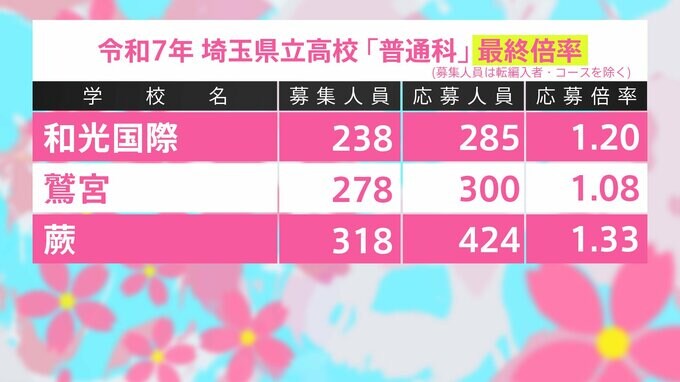 埼玉県立高校入試2025 全日制普通科 最終志願倍率は大宮が1.51倍、川越南1.48倍、浦和1.47倍、川越1.47倍に【令和7年度高校受験】 TBSテレビ 2025年2月20日(木) 11:45 国内 学校別の一覧 蕨1.33倍、和光国際1.20倍