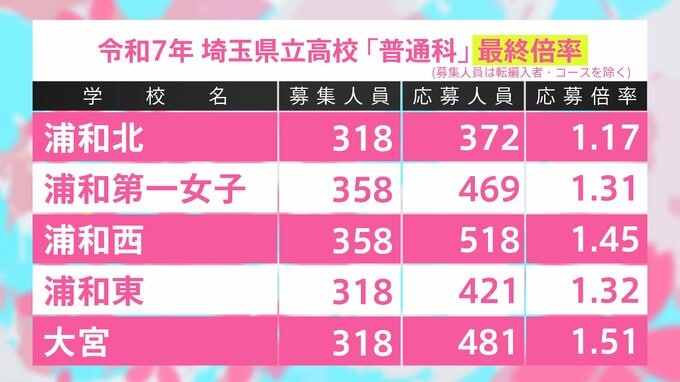 埼玉県立高校入試2025 全日制普通科 最終志願倍率は大宮が1.51倍、川越南1.48倍、浦和1.47倍、川越1.47倍に【令和7年度高校受験】 TBSテレビ 2025年2月20日(木) 11:45 国内 学校別の一覧 大宮1.51倍、浦和西1.45倍