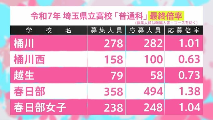 埼玉県立高校入試2025 全日制普通科 最終志願倍率は大宮が1.51倍、川越南1.48倍、浦和1.47倍、川越1.47倍に【令和7年度高校受験】 TBSテレビ 2025年2月20日(木) 11:45 国内 学校別の一覧 春日部1.38倍、川口北1.28倍