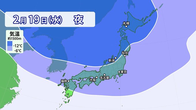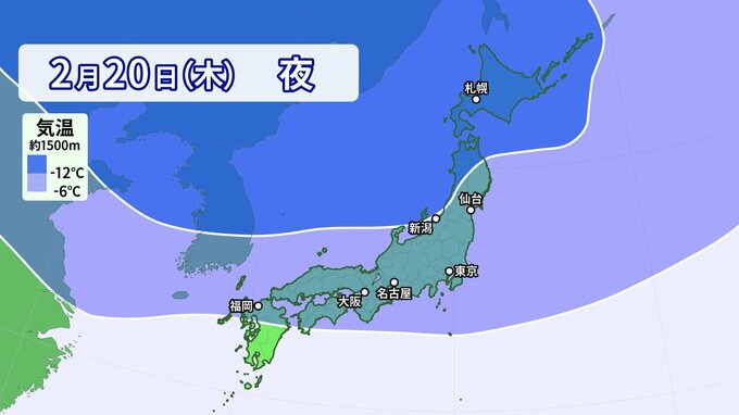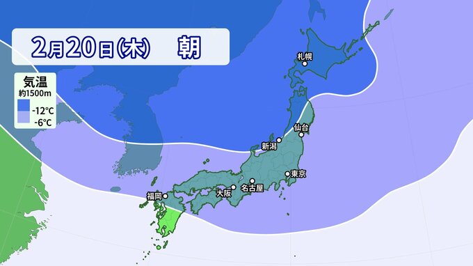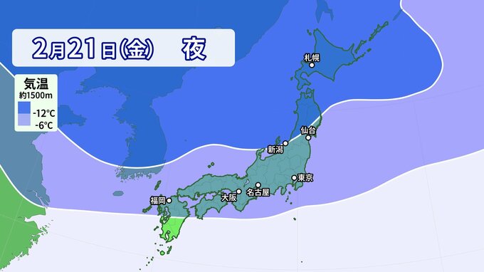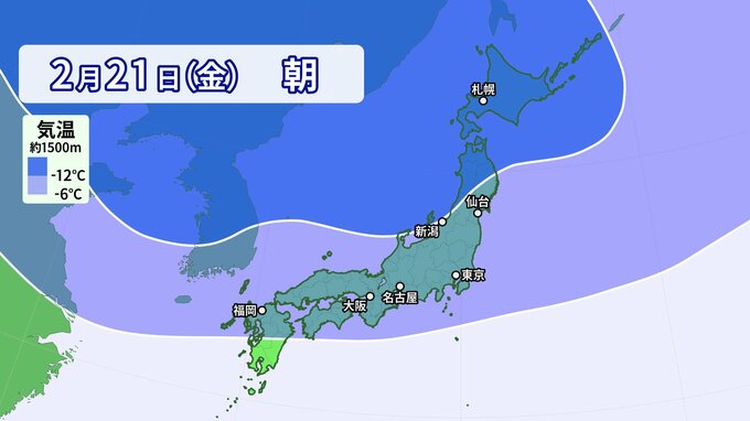 まず寒気の予想です。上空1500m付近で-6℃以下の寒気は、平地でも雪になる目安の寒気で3連休最終日の24日(月)頃まで、日本の上空に居座る予想です。
