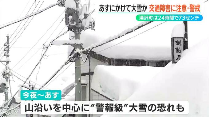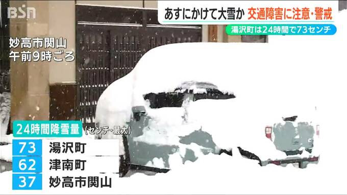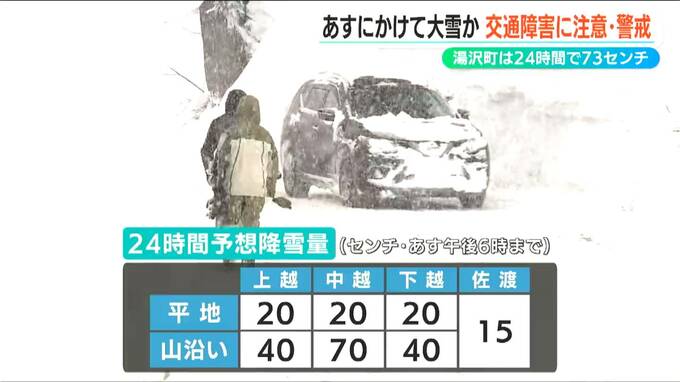 県内は19日も雪が降り続き、24時間の最大降雪量は湯沢町で73センチ、津南町で62センチ、妙高市 関山で37センチとなっています。