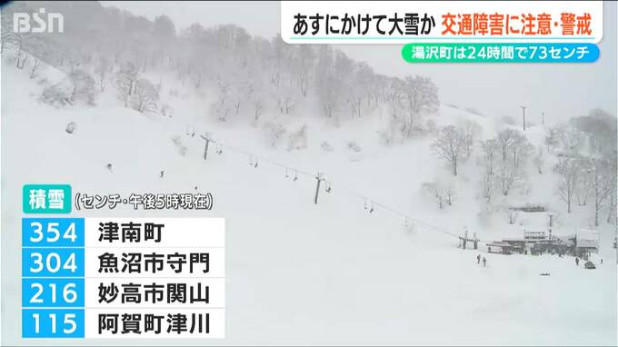 午後5時現在の積雪は津南町で3メートル54センチ、魚沼市 守門で3メートル4センチ、妙高市 関山で2メートル16センチとなっていて積雪は増えています。