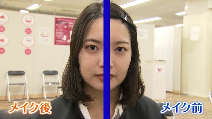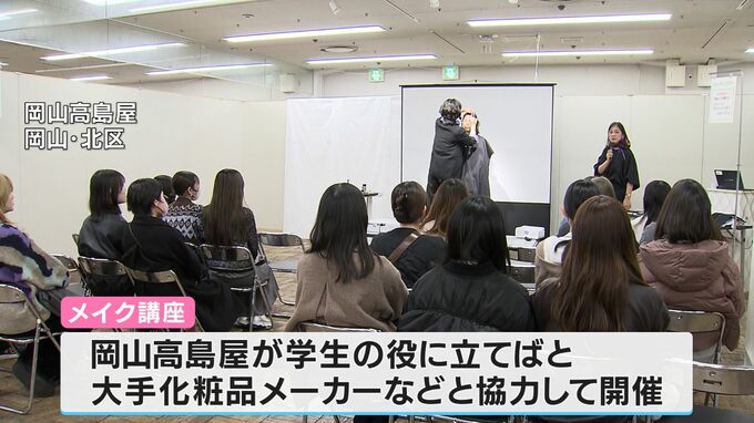 このメイク講座は、岡山高島屋が学生の役に立てばと大手化粧品メーカーなどと協力して開いたものです。これから就職活動に取り組もうという大学生など、約20人が参加しました。