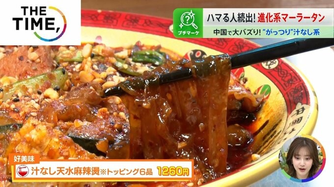 「汁なし天水麻辣燙」(トッピング6品・1260円)は、スープの代わりに自家製ラー油たっぷりのタレがかかった“汁なし”麻辣湯。